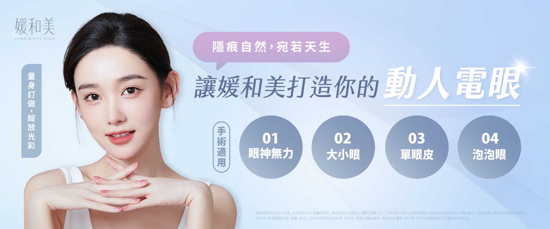 實際療程效果因人而異,本資訊無法代替醫師問診,療程效果與風險均以醫師診斷為主。文案中照片僅作為輔助醫師治療說明或衛教資料之輔助圖片,並經當事人簽署授權書同意曝光。副作用:眼瞼外翻或雙眼不對稱之一時性現象、傷口感染等;禁忌症:眼部有感染疾病者、乾眼症患者等。更多完整醫療狀況由醫師詳細解說。