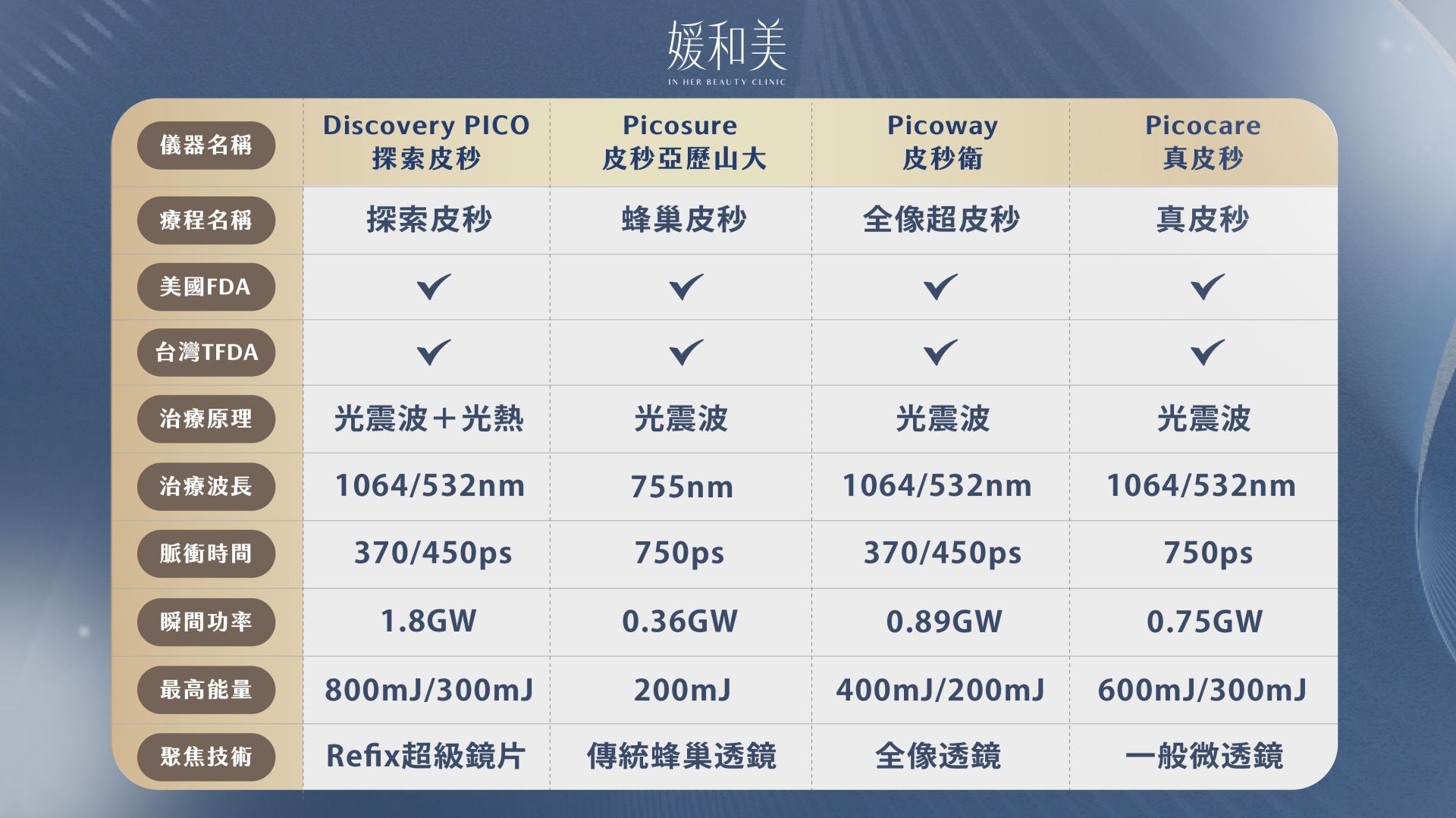 只要符合「能量單次擊發時間單位為皮秒」的雷射儀器,都可以稱為皮秒雷射, 但探索皮秒雷射為目前市面上最高階皮秒儀器,可以由能量釋放瞬間提供的震碎效益,和熱傷害多寡來評估,越高階的皮秒雷射,脈衝時間會越短。