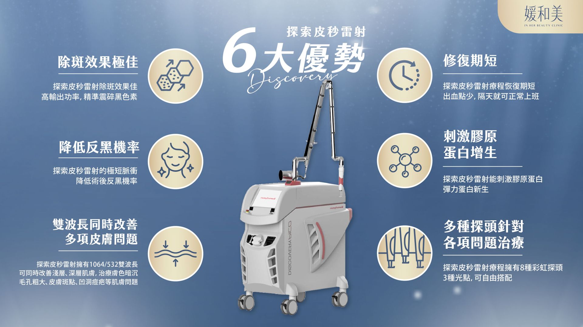 探索皮秒雷射療程擁有8種彩虹探頭、3種光點,可自由搭配