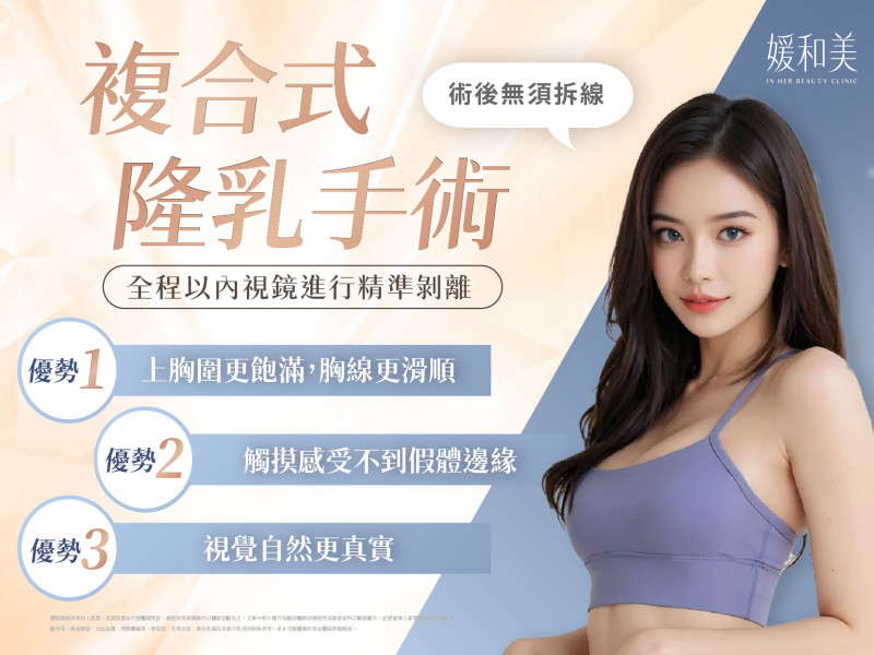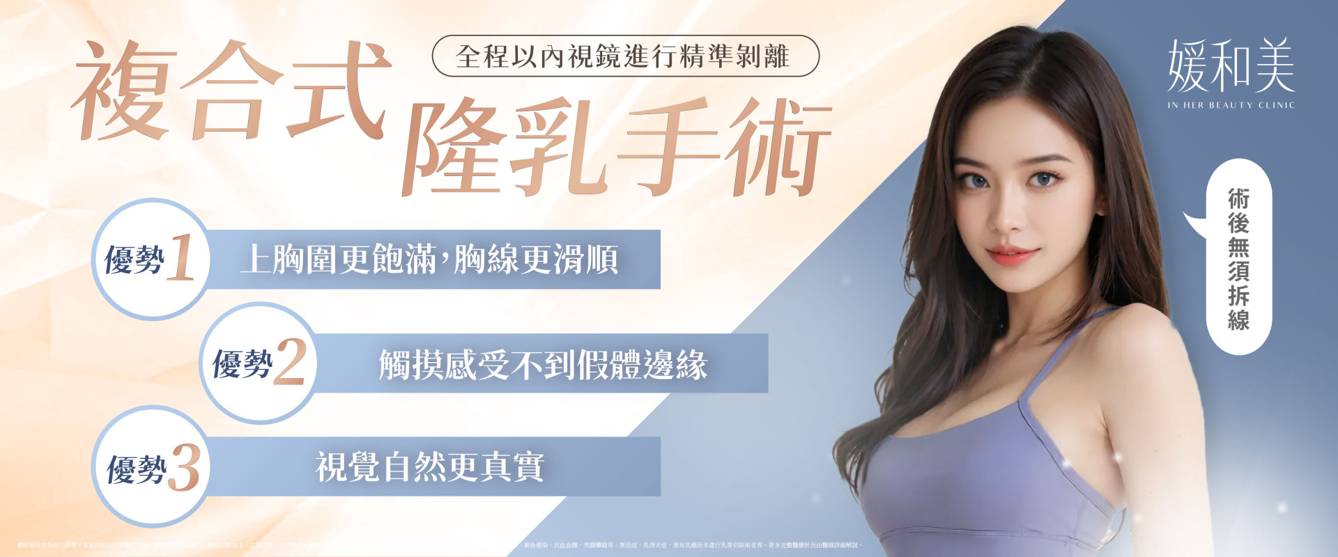 為了改善上述問題,會建議使用「複合式隆乳」的方法,將胸大肌一分為二,讓假體的上半部塞在胸大肌的下方,下半緣則是放在筋膜下,這樣的作法是透過肌肉蓋在假體的上緣地方,改善上胸不平順,避免北半球過度假體外觀明顯的現象,此外再透過自體脂肪豐胸的方式,使假體周圍補充脂肪。