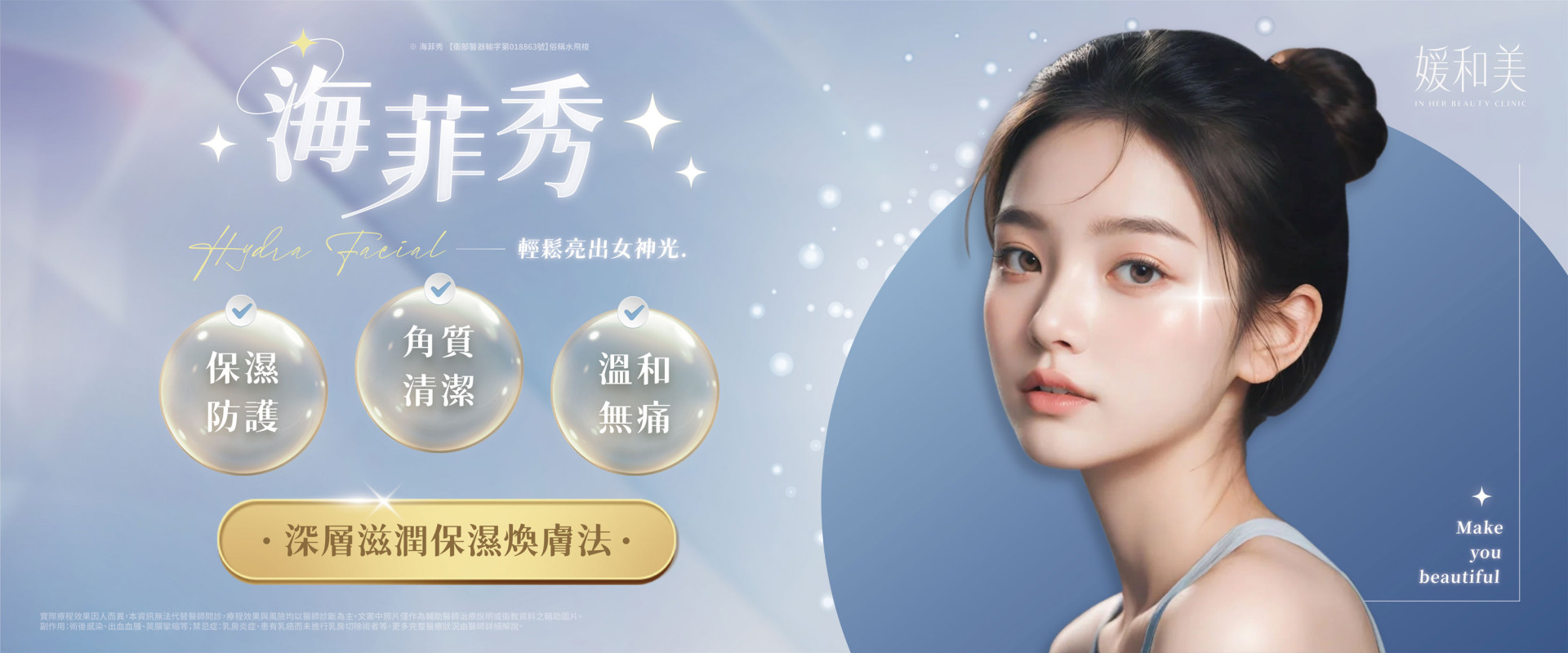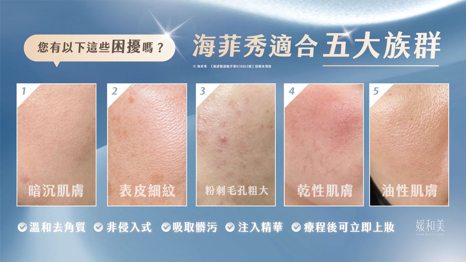 有醫美界Dyson吸塵器的美國原廠海菲秀(俗稱水飛梭)成為現在眾多人喜愛的醫美項目。溫和無痛地清除臉上堆積的髒污與老廢角質,維持透亮、健康的良好肌膚狀況。讓肌膚在保濕力充足的情況下,改善膚質上的微小瑕疵與多樣性肌膚問題。代謝老廢角質、肌膚補水保濕、清潔粉刺毛孔、改善暗沉膚色不均、清除髒汙。徹底清潔毛孔油脂雜質,去除表皮老化角質皮屑,無痛拔除黑頭粉刺,並深層滋潤保濕的煥膚法。